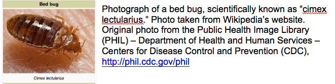 For more information on bed bugs, how to prevent them, how to identify them, and what to do about them, click on the links: http://bedbugsinfo.ca/ or http://en.wikipedia.org/wiki/Bed_bug