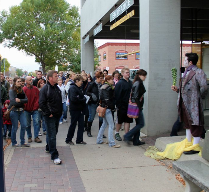 The yellow material represented the canola field. As the audience followed the canola around the backs of buildings, we were treated to performances by students in the Red Deer College theatre program. A farmer and his unwed daughter were seen in various poses, such as, harvesting the fruit off the trees and clearing the land of rocks.